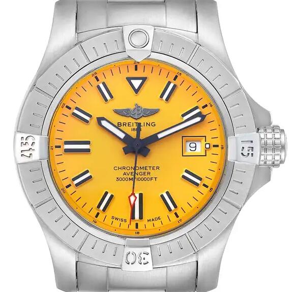 The Breitling Avenger series is known for its rugged design, making it a go-to choice for aviation professionals and watch enthusiasts alike. The yellow dial in the perfect Breitling Avenger replica watches adds a vibrant contrast to the watch’s tough, military-inspired aesthetic. Whether it’s the strong stainless steel case or the exceptional movement, the Breitling Avenger with a yellow dial is a symbol of Breitling’s commitment to high-performance timepieces. It is a perfect example of how Breitling blends functionality and style.