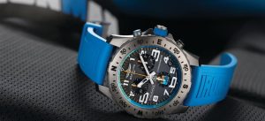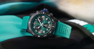 The 300-piece limited edition Breitlight Endurance Pro celebrates the finale event in Marbella, Spain. With a turquoise ombré dial and orange accents, the vivid colors stand apart from the dark case. Breitlight is Breitling’s proprietary polymer material. Being 43% lighter than stainless steel gives it endless wearability and high resistance to scratches. The case diameter is also 44mm with a thickness of 12.5mm, the same as the titanium edition.